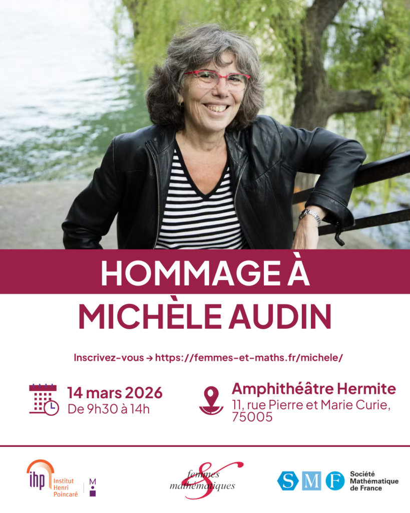 Une conférence en hommage à Michèle Audin a été organisée par femmes et mathématiques, la Société Mathématique de France et l’Institut Henri Poincaré le 14 mars 2026 à l’IHP, 11 rue Marie et Pierre Curie, amphithéâtre Hermite, de 9h à 13h.